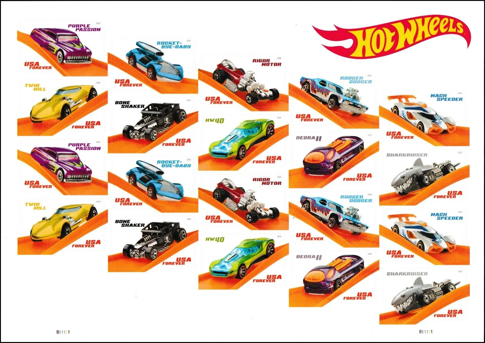 The USPS released a set of 10 Stamps, each showcasing a different beloved Hot Wheels car speeding along the vibrant orange track. The featured cars include Purple Passion, Rocket-Bye-Baby, Rigor Motor, Rodger Dodger, Mach Speeder, Twin Mill, Bone Shaker, HW40, Deora II, and Sharkruiser.