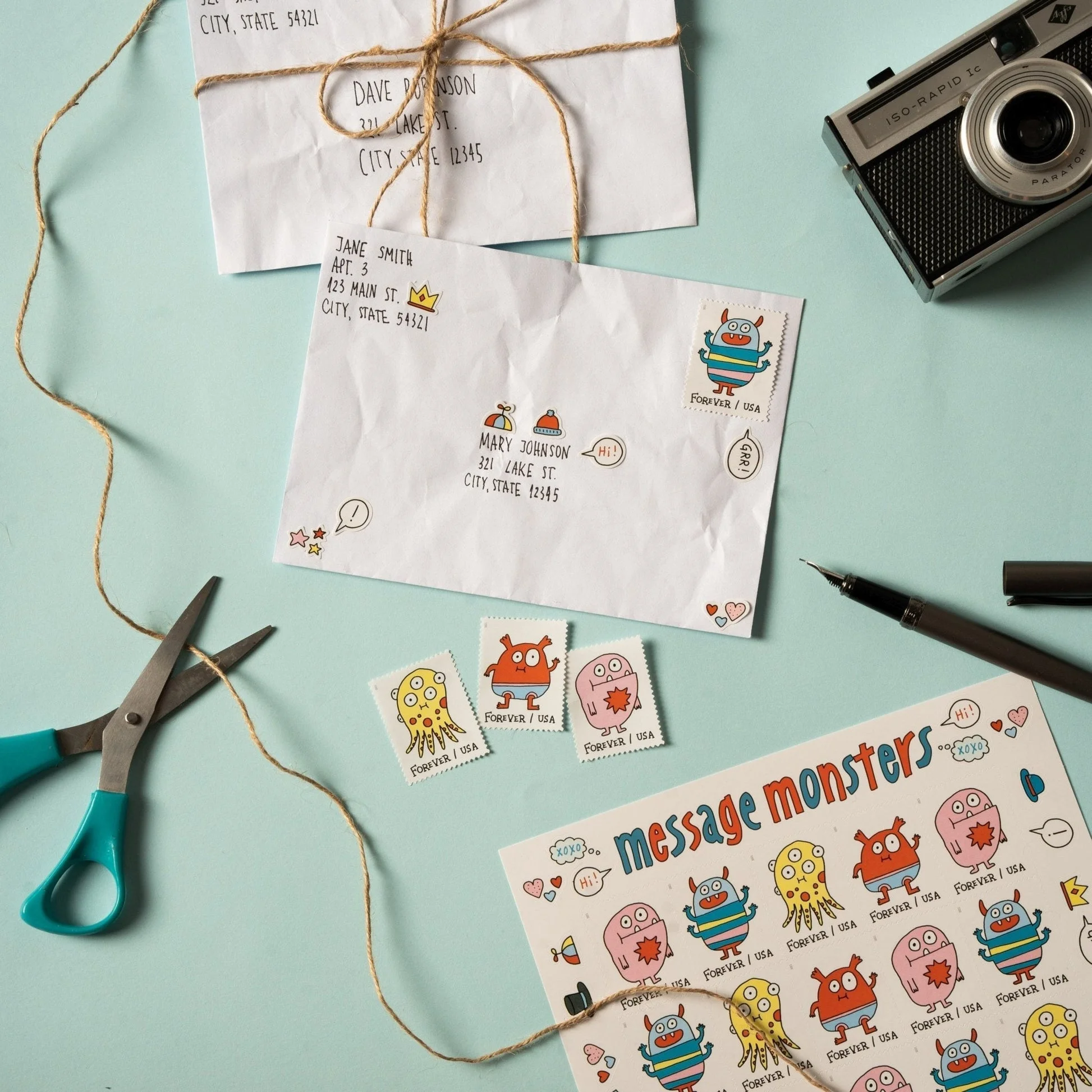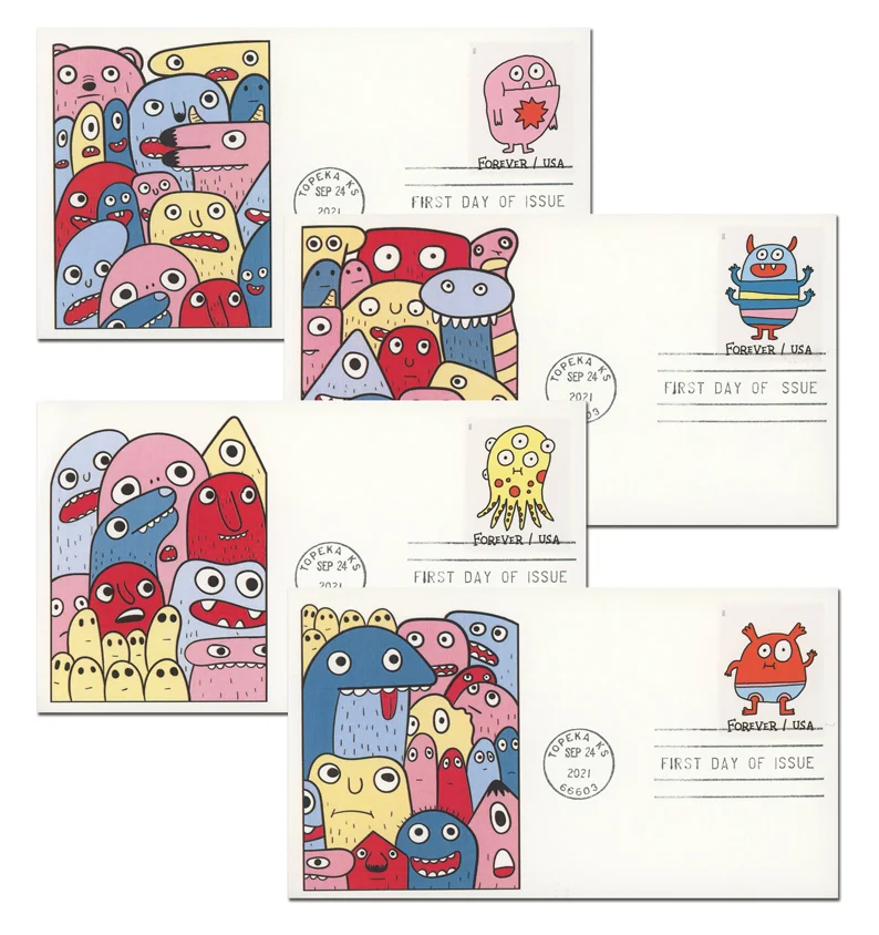 In 2021, the United States Postal Service issued a set of four Forever Stamps picturing Message Monsters. The childlike designs were created in collaboration with Canadian children’s author Elise Gravel to help get kids more interested in Stamps and mailing letters.