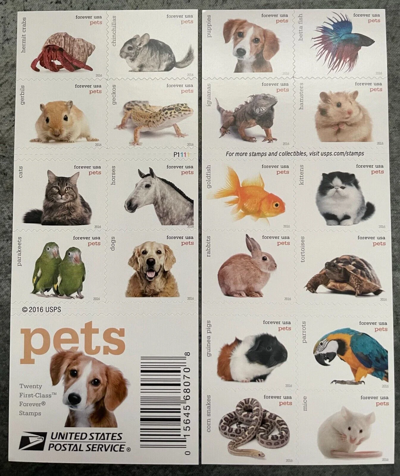 Stamp designs by Eric Issel??e showcase 20 domesticated animals: puppies, betta fish, iguanas, hamsters, goldfish, parrots, guinea pigs, tortoises, rabbits, kittens, corn snakes, mice, hermit crabs, chinchillas, gerbils, dogs, parakeets, horses, cats, and geckos.