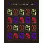 The Postal Service issues four Forever Stamps in time for Halloween. The Spooky Silhouettes Stamps feature digital illustrations with Halloween motifs rendered as black silhouettes in eerily backlit windows.