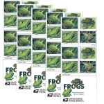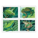 Digital illustrations of four North American frogs grace these new Stamps: the Pacific tree frog, the northern leopard frog, the American green tree frog, and the squirrel tree frog. Working with a primarily green color palette, the artist captured the essence of each animal with enough important defining features to make each recognizable.